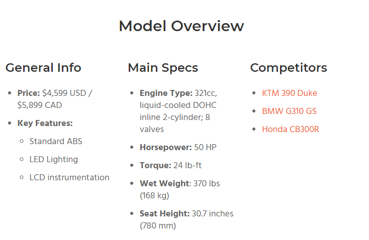 BMW G310R과 비교해서 16 마력 높고, 전장이 길고, 10kg 더 묵직하다.