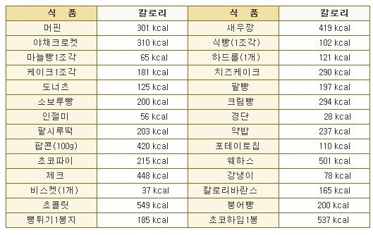 < 음식별 칼로리표 >