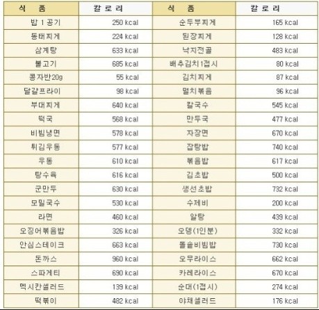 이번에는 음식 별 칼로리에 대해서 알아 보겠습니다.